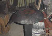 The following series of pictures will illustrate the steps in raising a Norman conical helmet from a flat sheet of .074" mild steel. The tools used were a coke forge, two round faced hammers, an 8" diameter mushroom stake, and a special "T" stake made from pieces of railroad track. All of the shaping was done from the outside, there was no stretching from the inside of the blank.